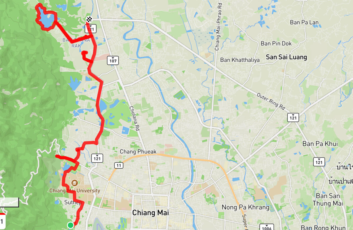 Маршрут стартует в парке Huan Teng Tao lake и далее уводит по лесным дорогам в горные деревушки между Doi Suthep и Doi Pui.