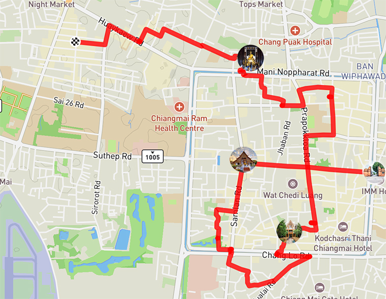 Вы можете проехать этот маршрут, стартуя у ворот Tha Phae Gate и завершить в Ниммане, а можете наоборт. Все зависит от того, где вы поселились в Чиангмае.