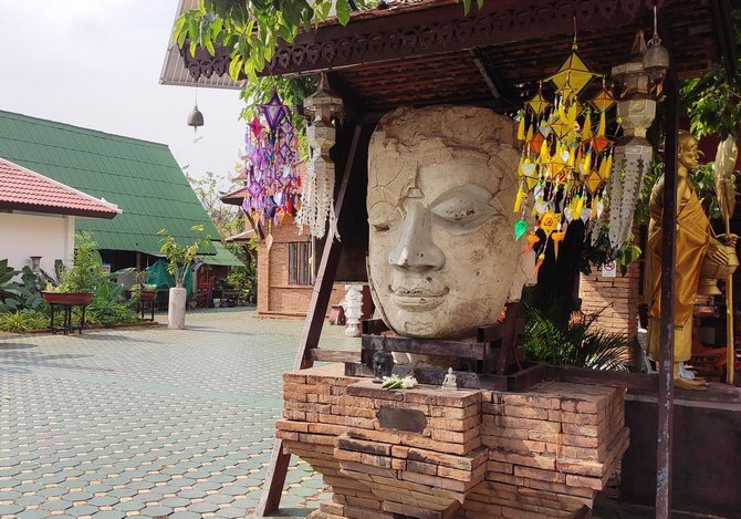 Храм спрятан внутри внутри квартала, поэтому вы удивитесь тому, как мало здесь туристов и вообще посетителей. Кроме ярко раскрашенных храмов здесь есть туннель в виде фигуры Дракона, соединяющийся с фигурой тигра. Вы можете зайти в него через пасть тигра, а выйти из пасти Дракона или наоборот. Внутри тоннеля на стенах изображены сцены из жизни Будды. Место тихое, после хаотичного движения в центре Чиангмая, очень подходит, чтобы перевести дыхание и очистить разум.