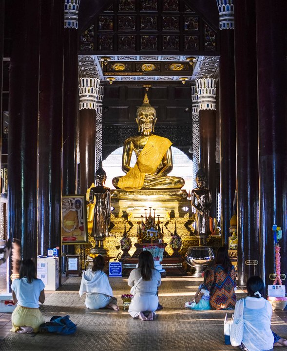 В большом зале храма установлен золотой Будда, позади храма пагода. А перед воротами вас встретят два белых слона.