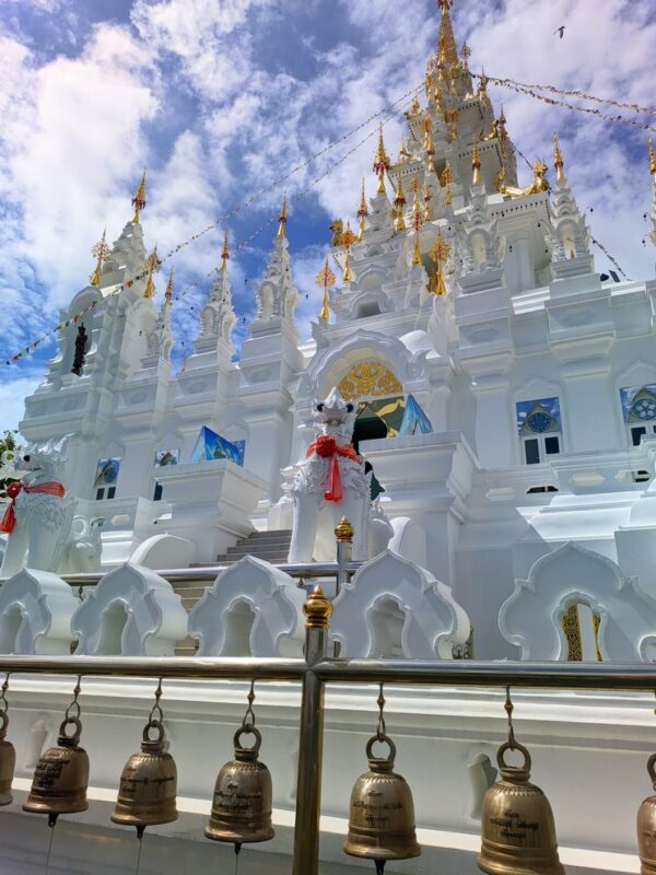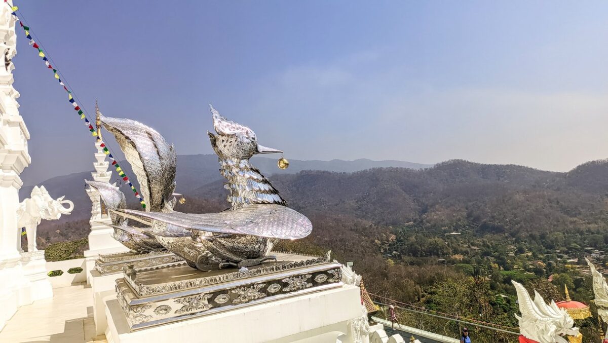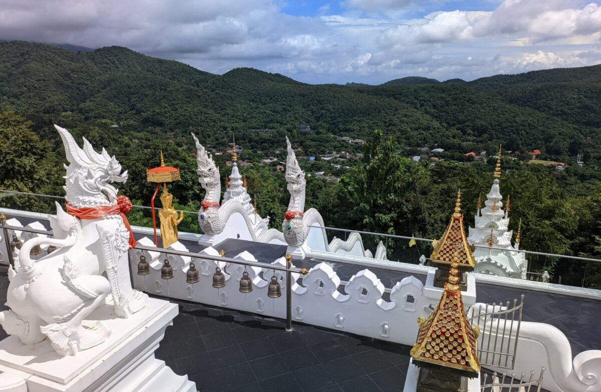 Если слева вы проезжаете стадион, а впереди видите местную школу, то самый момент сворачивать к Белому храму. Ориентир — храм Wat Ban Pong. Справа от него начинается подъем в 500 ступеней к Храму. Если работать ногами вы устали, то красные маршрутки за 40-50 батт завезут вас к храму по дороге. В будние дни можете проверить свое упорство и вкатить в горку сами. Уклон около 16 градусов. Проверьте тормоза и вниз съезжайте аккуратно. Со стен Белого Храма открывается шикарный вид на южные районы Чиангмая.