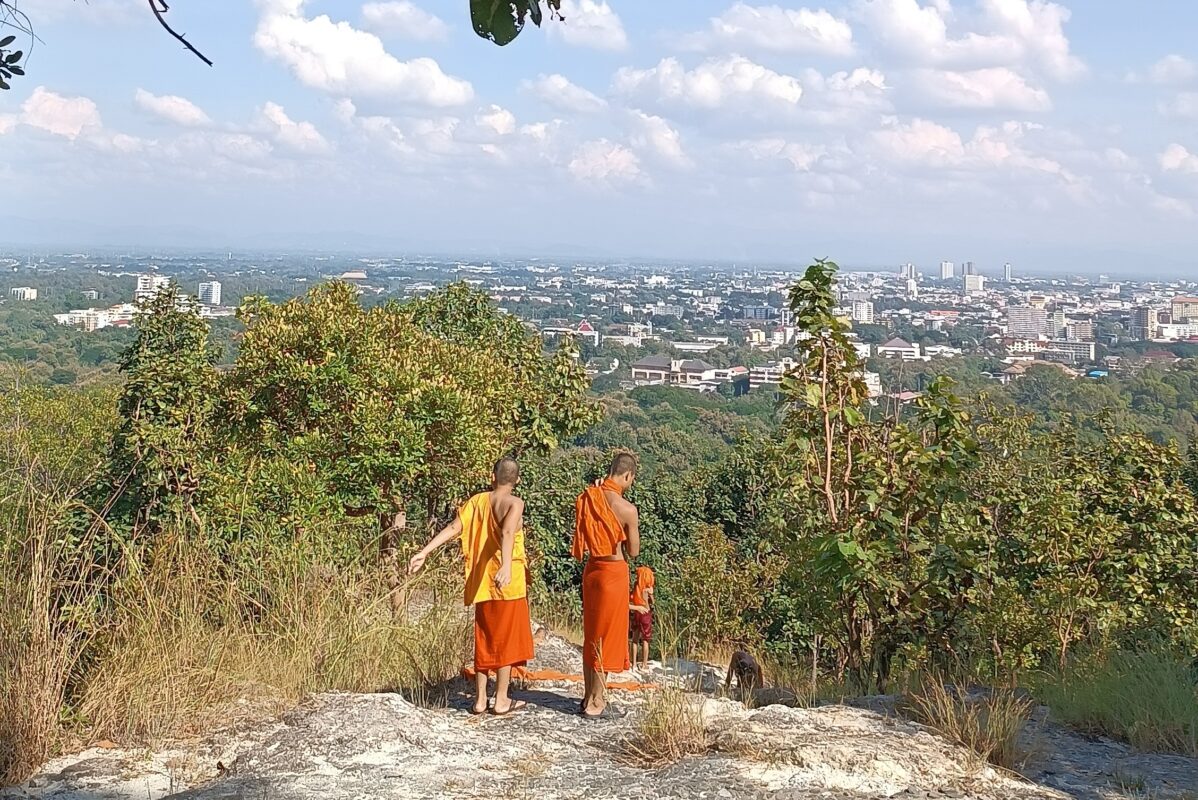 Из интересных мест, которые стоит посмотреть — Храм Wat Pha Lat. Вы можете подняться к нему отдельно по тропе Монков (Monks trail) пешком. Но если раз проезжаете, то можете заглянуть в Wat Pha Lat на спуске. Этот храм спрятан в ушелье гор и некоторые его строения спрятаны в зарослях джунглей.